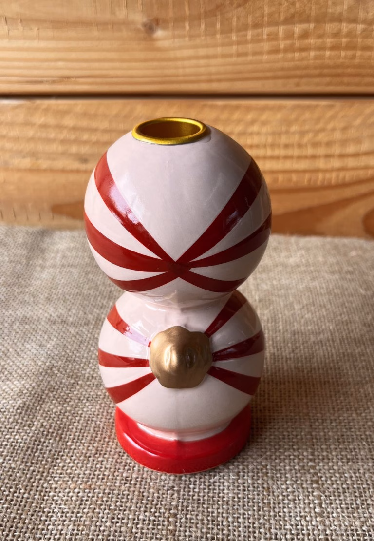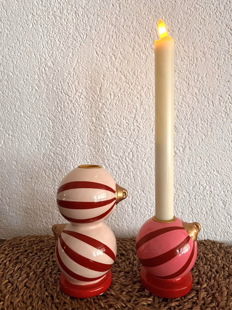 Speelse kaarsenhouder in de vorm van twee op elkaar gestapelde kerstballen, in crรจme/zachtroze met rood. De kandelaar is gemaakt van aardewerk en is 15 cm hoog en 7 cm breed. Combineer hem met de kandelaar met een enkele kerstbal of zet hem in een set met andere kandelaren of sfeerlichten voor een vrolijk effect!